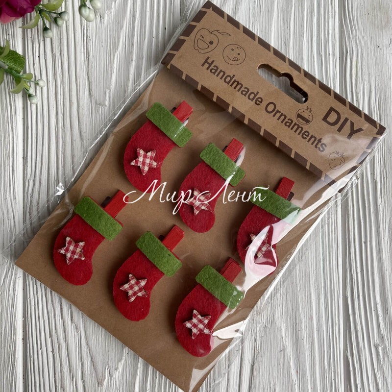 Прищепка новогодняя, 5х2,5 см, фетровый сапожек, упаковка 6 шт.