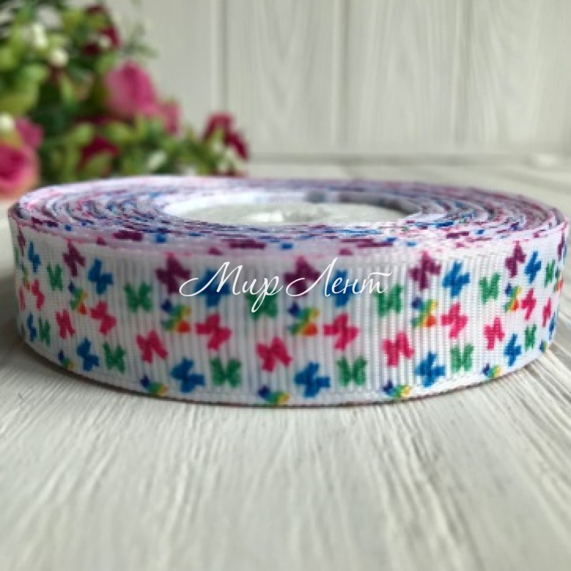 Репс 1,5 см, разноцветные бабочки на белом, рулон 23 м
