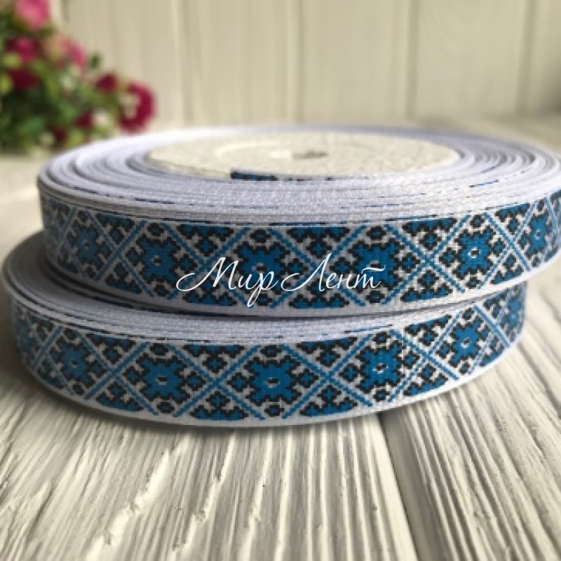 Репс 1,5 см, орнамент ромб, на синем, рулон 23 м