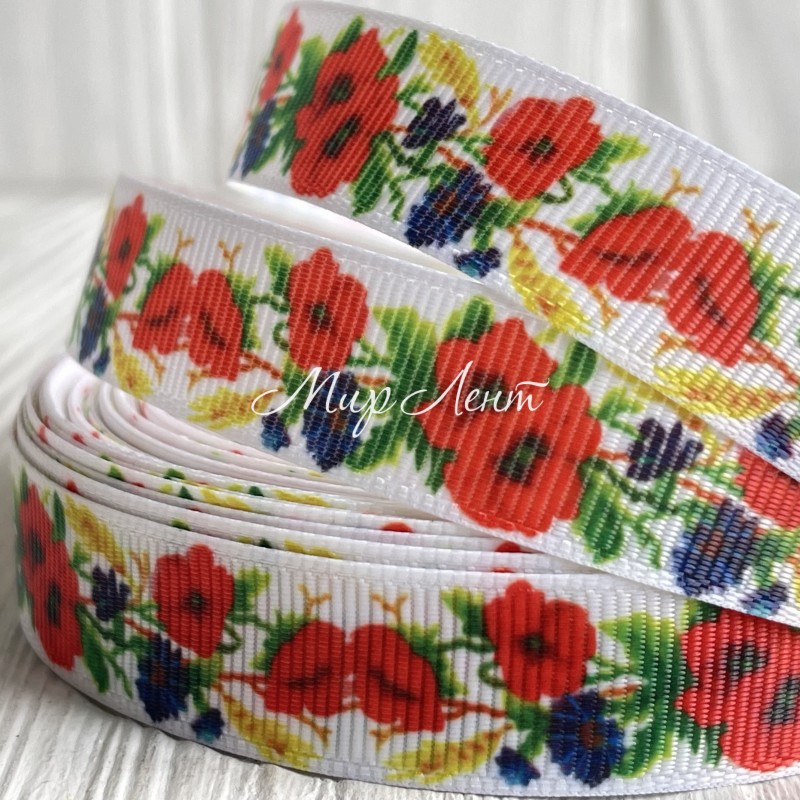 Репс 1,5 см, веночек с маками, васильками и колосками, на белом фоне, рулон 23 м