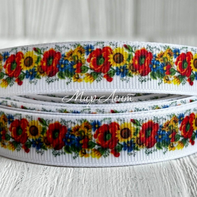 Репс 1,5 см, веночек с маков и подсолнухов, на белом фоне, рулон 23 м