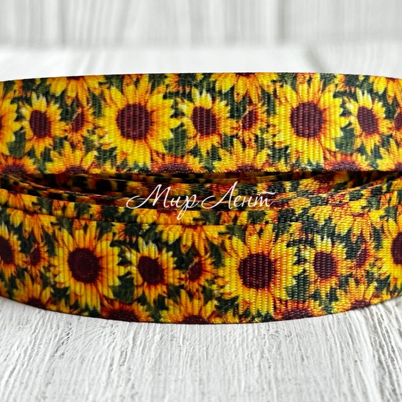Репс 1,5 см, желтые подсолнухи, на зеленом фоне, рулон 23 м