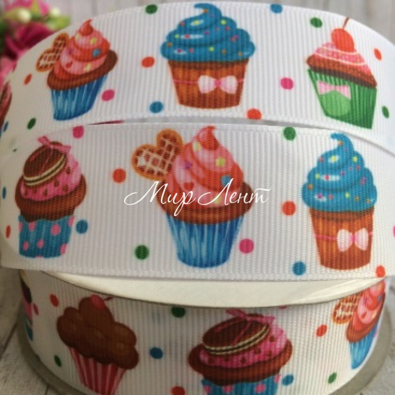 Репс 2,5 см, капкейки, белый с горохами, рулон 23 м