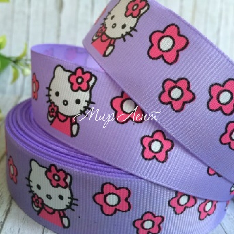Репс 2,5 см, Китти с цветочками, лиловый, рулон 23 м