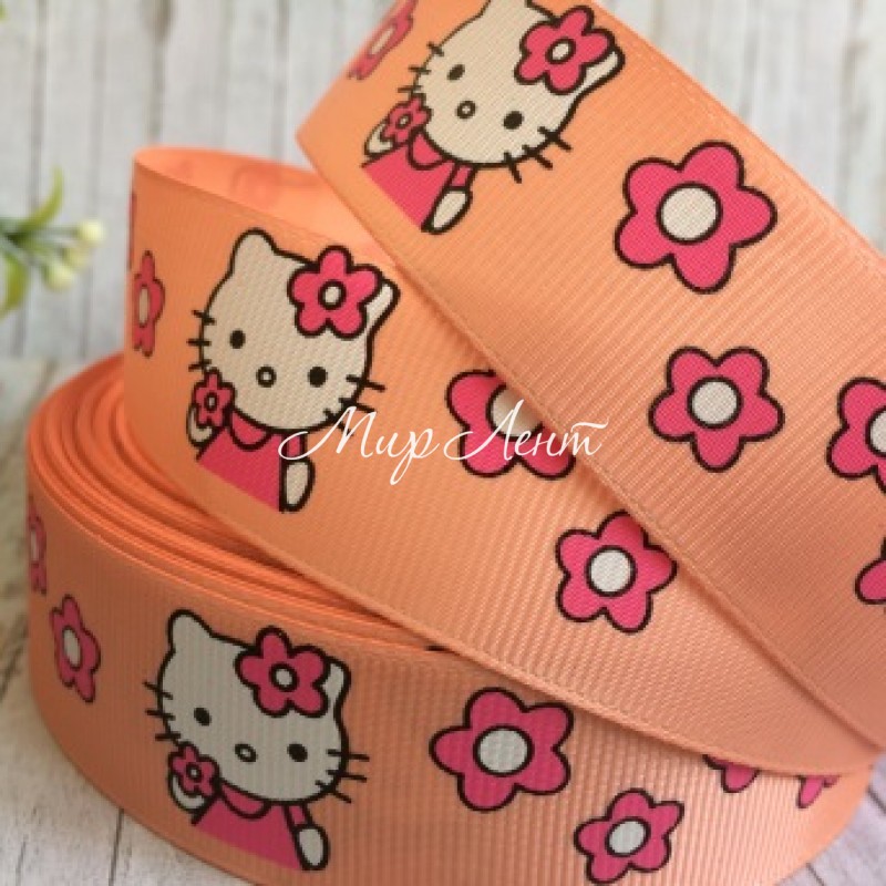 Репс 2,5 см, Китти с цветочками, персиковый, рулон 23 м