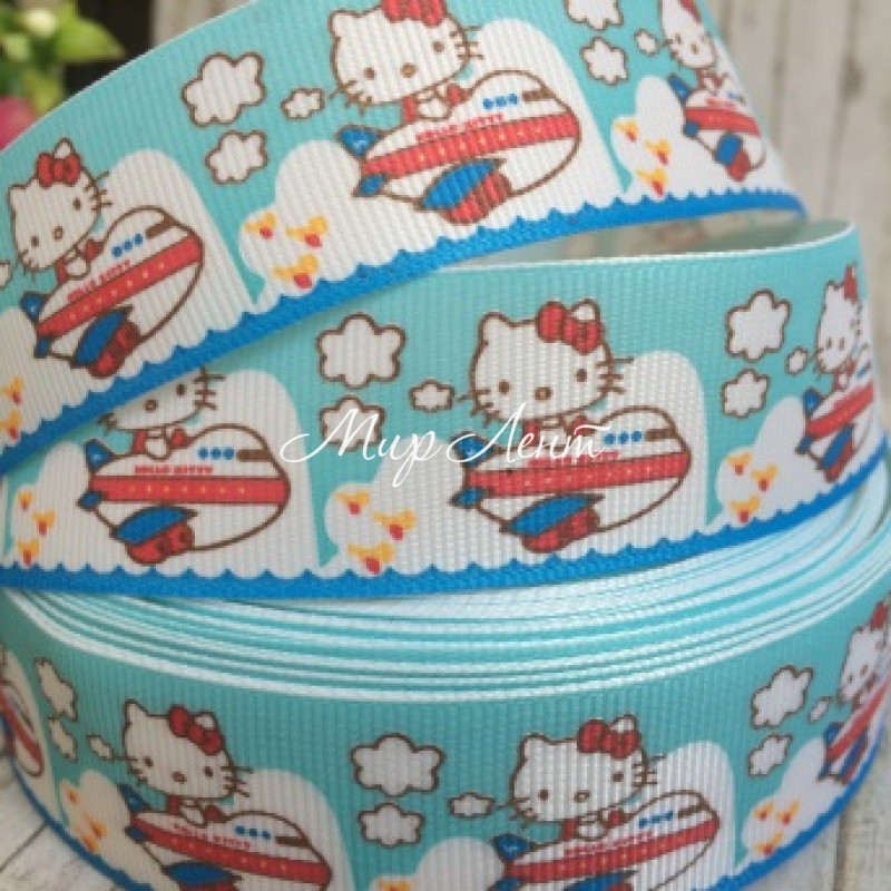 Репс 2,5 см, Китти в самолете, светло-бирюзовый, рулон 23 м
