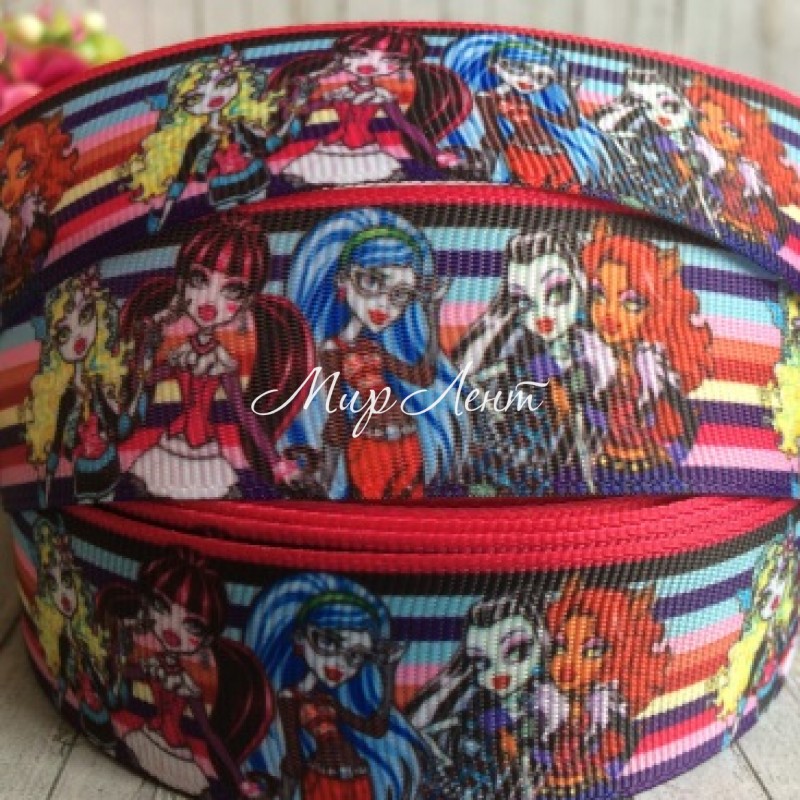 Репс 2,5 см, Monster High, разноцветная полоса, рулон 23 м