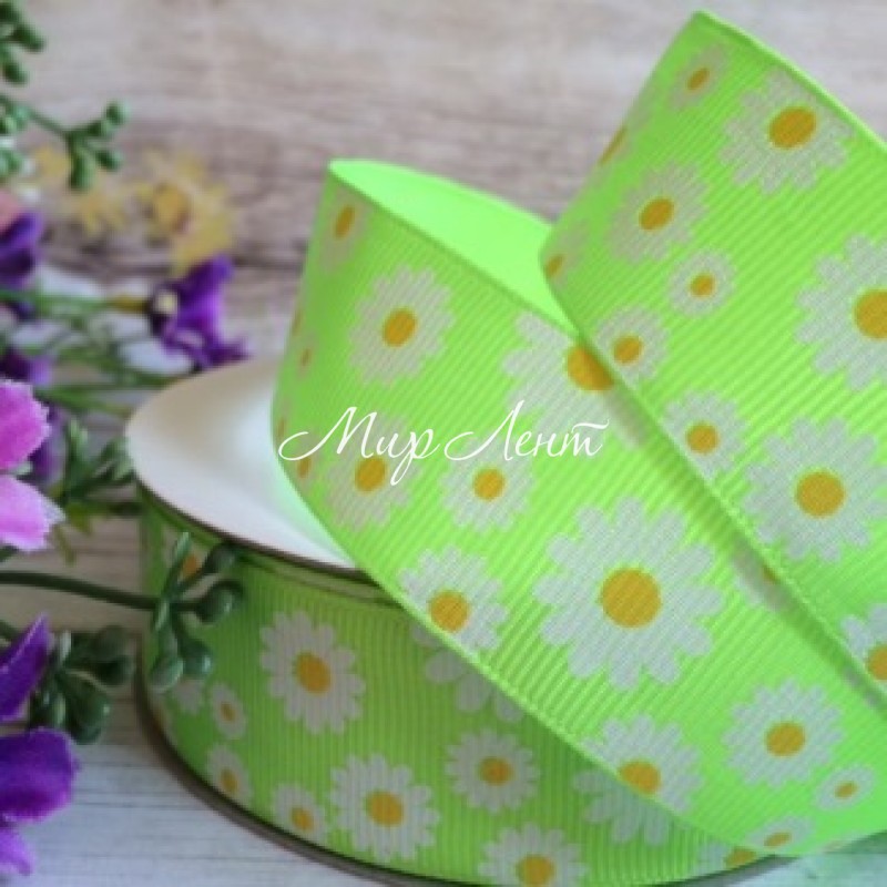 Репс 2,5 см, ромашка, салатовый, рулон 23 м