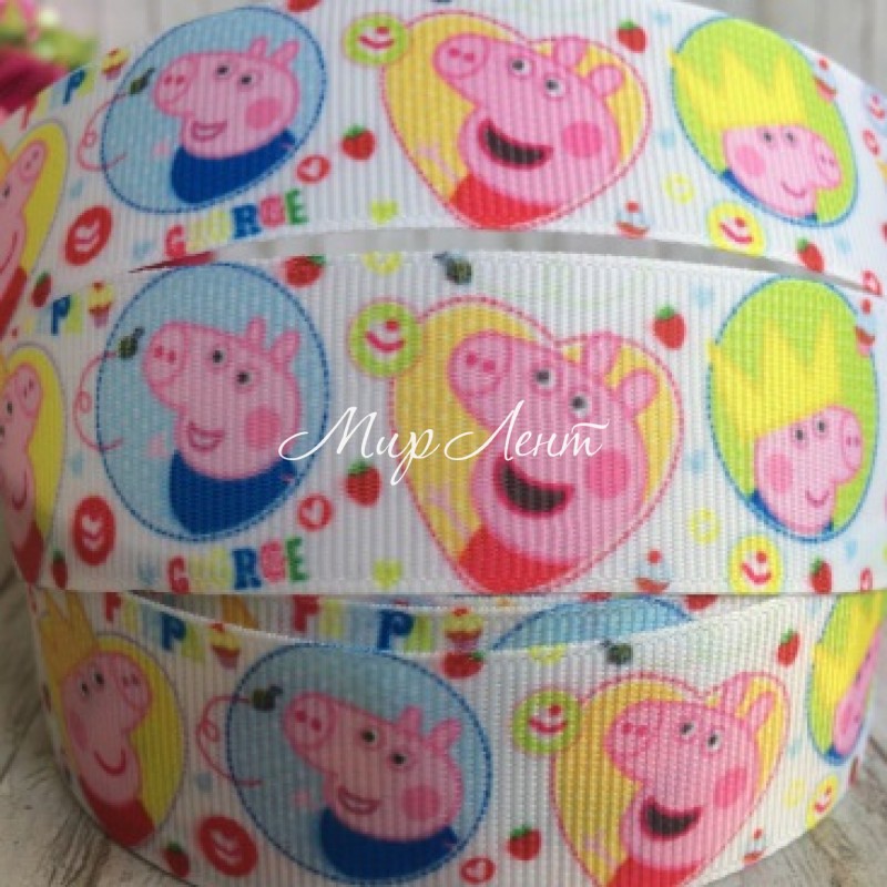Репс 2,5 см, свинка Пеппа и Джордж в коронах, белый, рулон 23 м