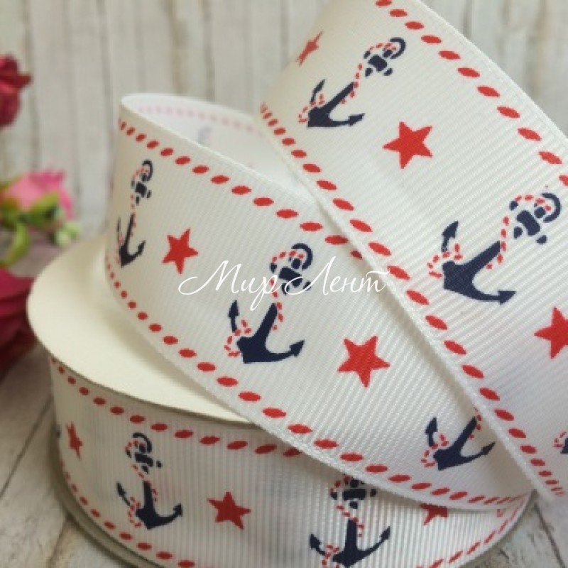 Репс 2,5 см, якорь и звездочка, белый, рулон 23 м