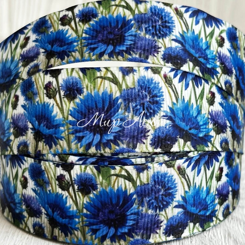 Репс 2,5 см, большие синие васильки на белом, рулон 23 м