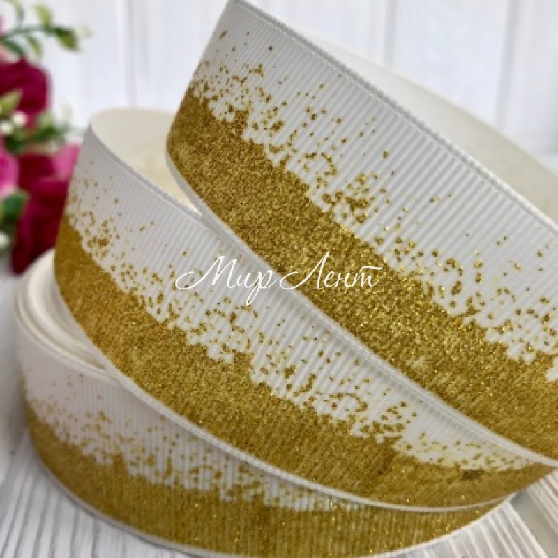Репс 2,5 см, глиттерная розсыпь, молочный с золотом, рулон 23 м