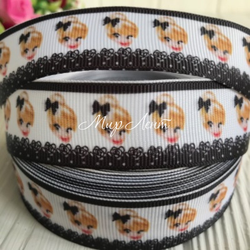 Репс 2,5 см, голова девочки на бело-черном, рулон 23 м