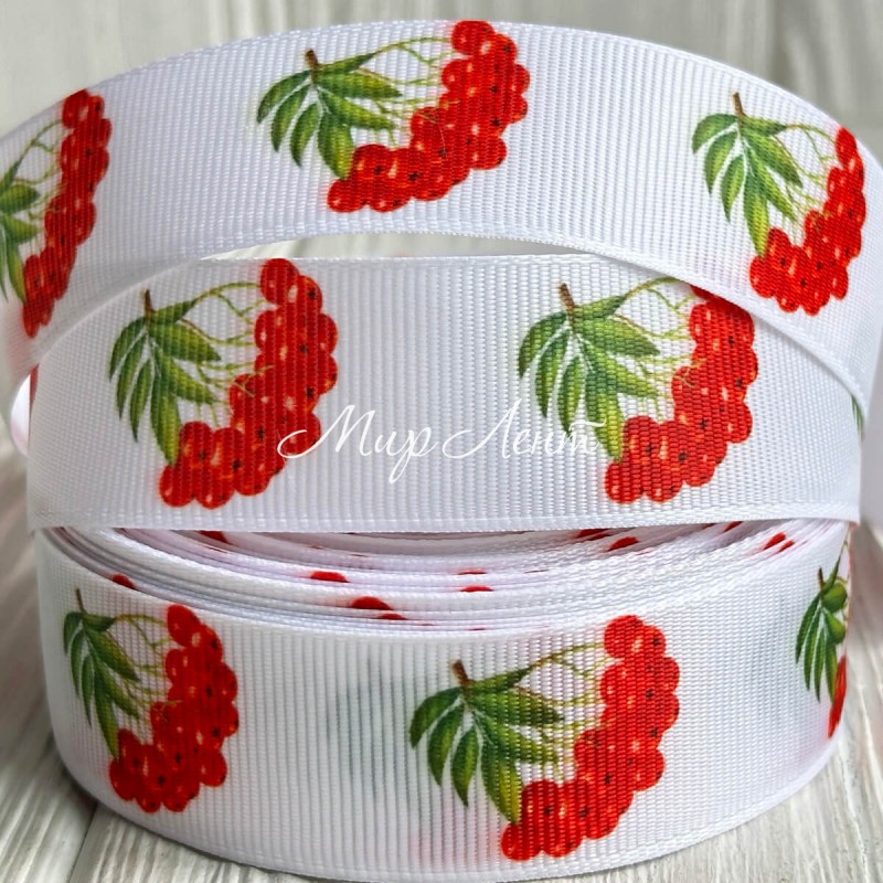 Репс 2,5 см, красная калина, на белом фоне, рулон 23 м