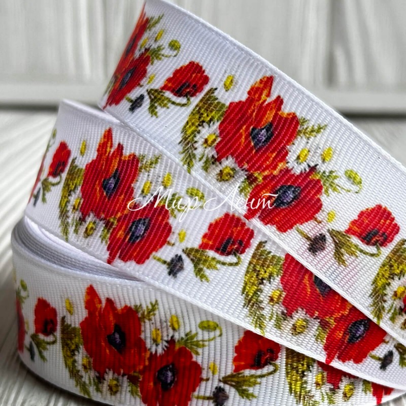 Репс 2,5 см, красные маки с ромашками, на белом фоне, рулон 23 м