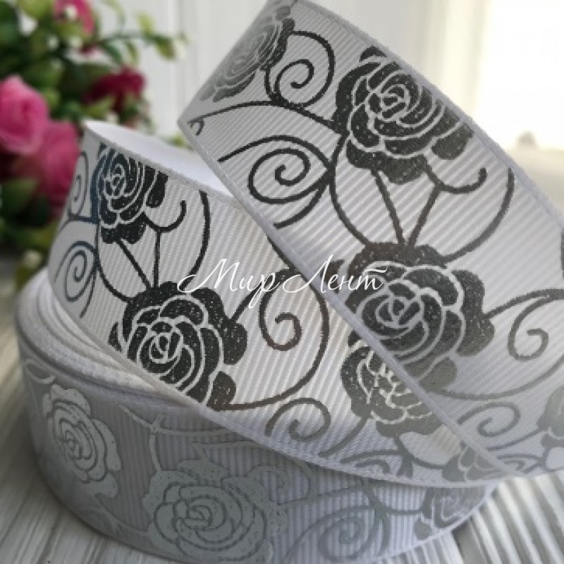 Репс 2,5 см, роза-голограмма серебро на белом, рулон 23 м