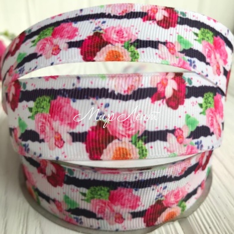 Репс 2,5 см, розово-бордовые розы, белый с черной полосой, рулон 23 м