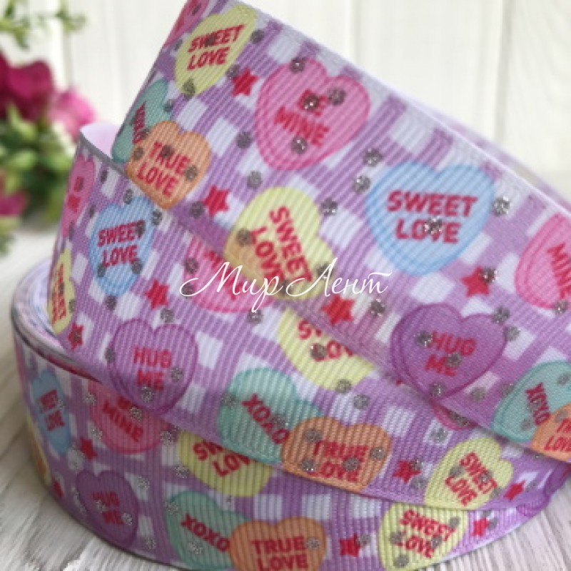 Репс 2,5 см, сердца sweet love с глиттерными точками на бело-сереневой клетке, рулон 23 м