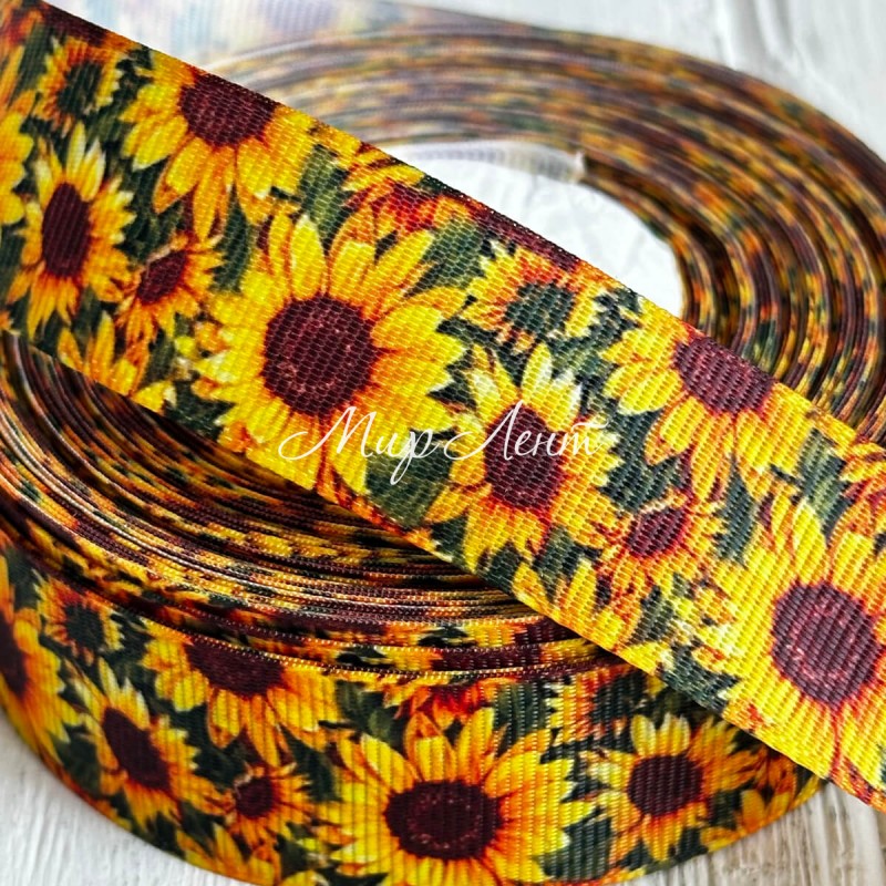 Репс 2,5 см, желтые подсолнухи, на зеленом фоне, рулон 23 м
