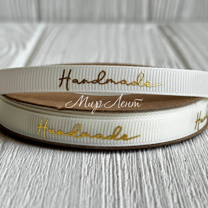 Репс c золотой надписью Handmade, 1 см, молочный, рулон 23 м