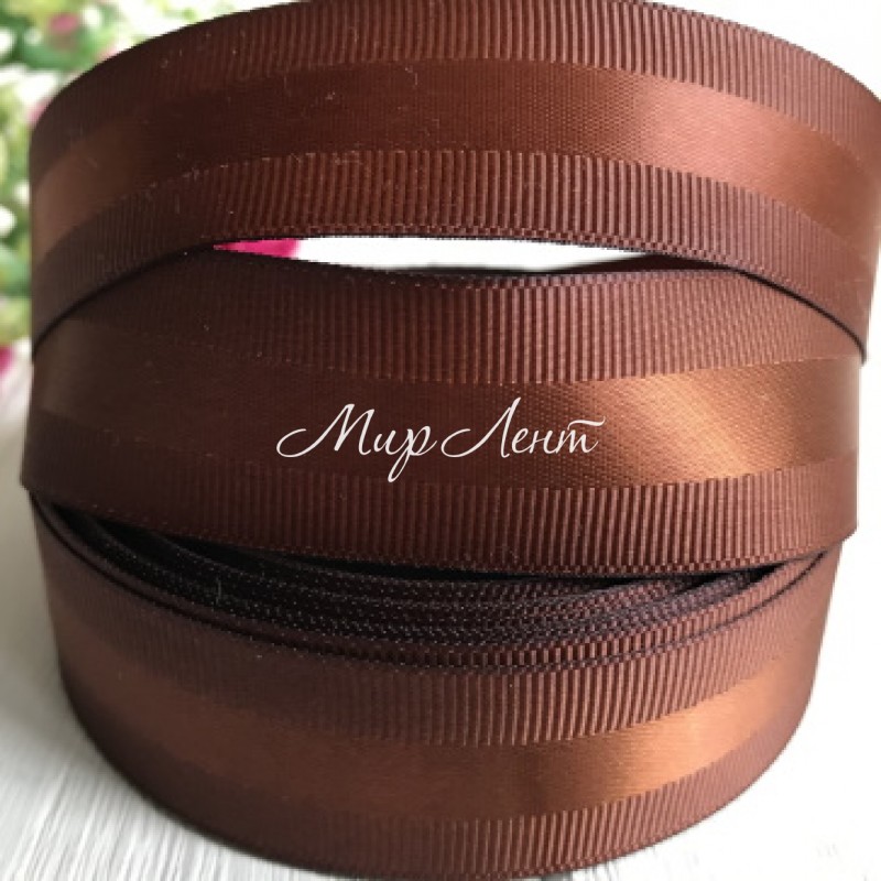 Репс с атласной полосой, 2,5 см, шоколадный, рулон 23 м