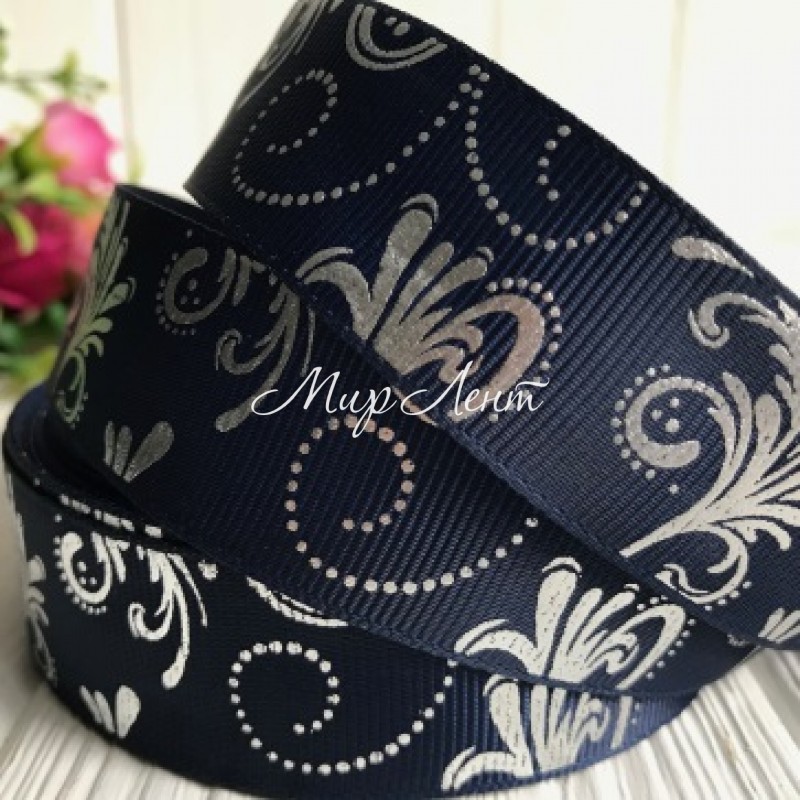Репс с вензелями, 2,5 см, сапфировый (серебро), рулон 23 м