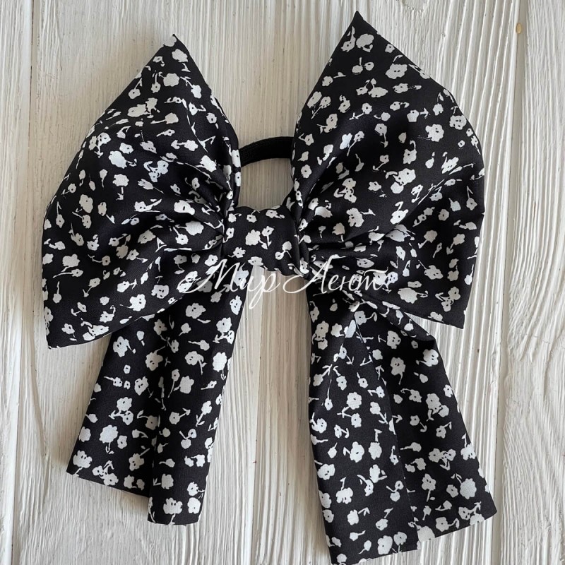 Резинка Твилли большой бант в цветочек, 16 см, черная с белым, шт.