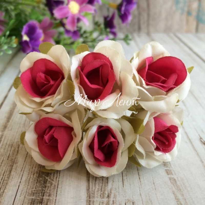 Роза тканевая, 2 см, бело-малиновый, упаковка 10 пучков