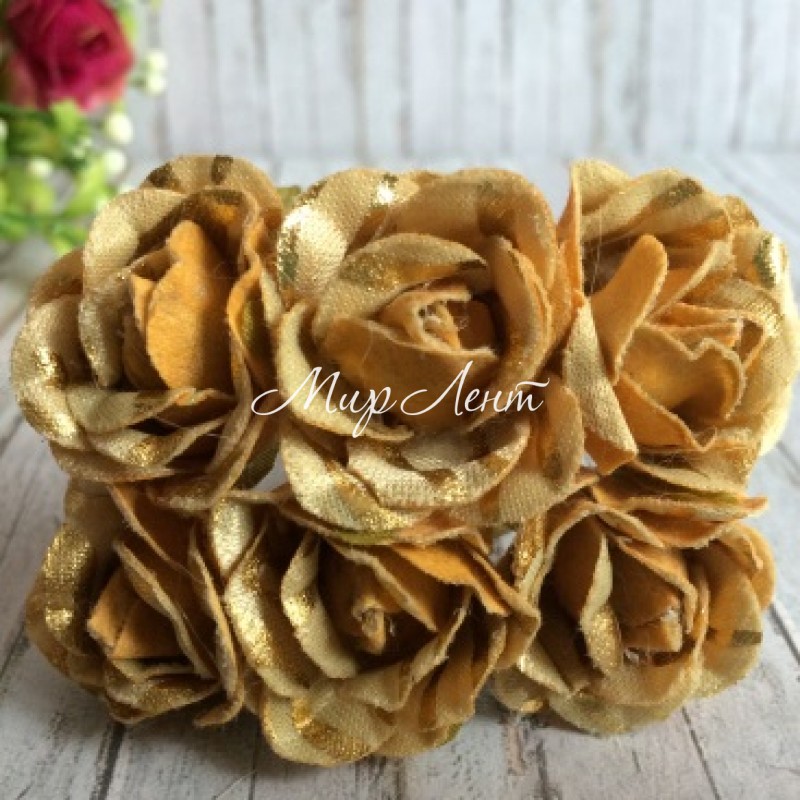 Роза тканевая с блеском, 2,5 см, капучино с золотом, упаковка 48 шт.