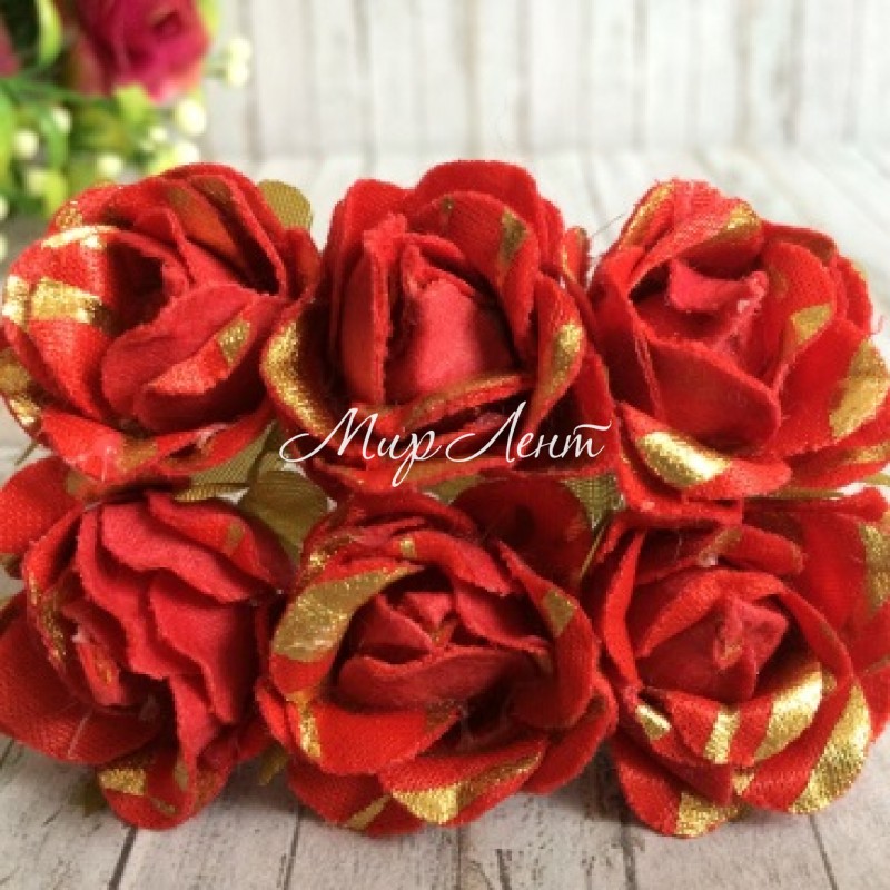 Роза тканевая с блеском, 2,5 см, красный с золотом, упаковка 48 шт.