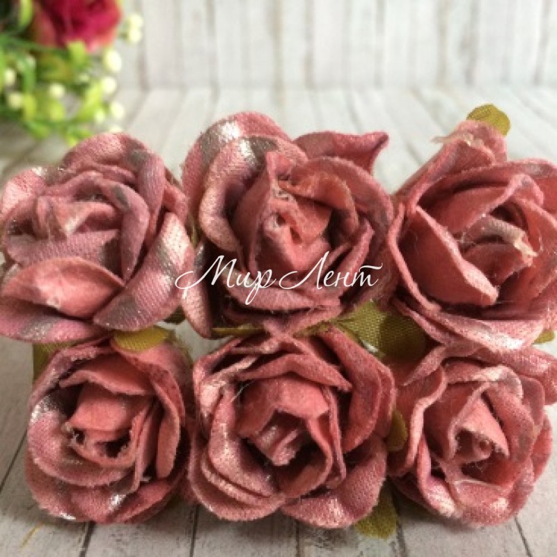 Роза тканевая с блеском, 2,5 см, пудровый с серебромм, упаковка 48 шт.