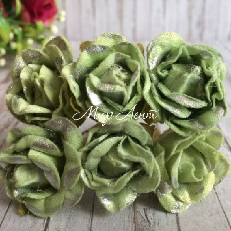 Роза тканевая с блеском, 2,5 см, светло-салатовый с серебром, упаковка 48 шт.