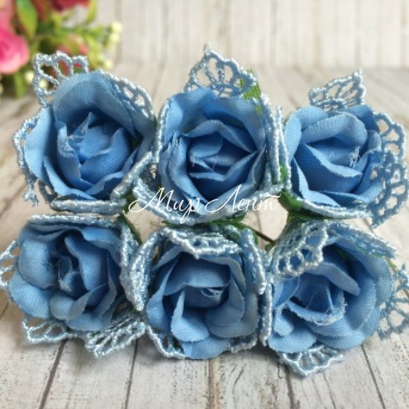 Роза тканевая (с кружевом), 2 см, голубая, упаковка 10 пучков