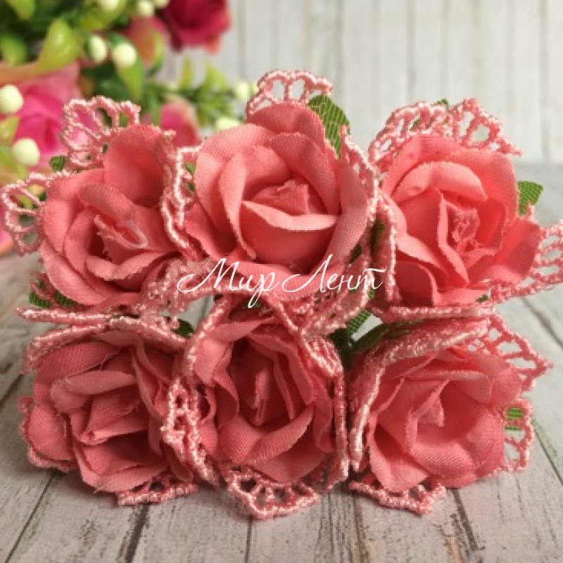 Роза тканевая (с кружевом), 2 см, коралловая, упаковка 10 пучков