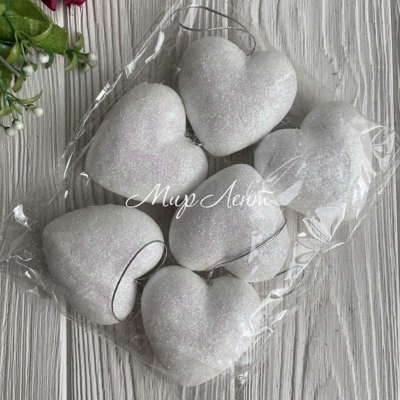 Сердечко-подвеска в глиттере, 6 см, белое, упаковка 6 шт.