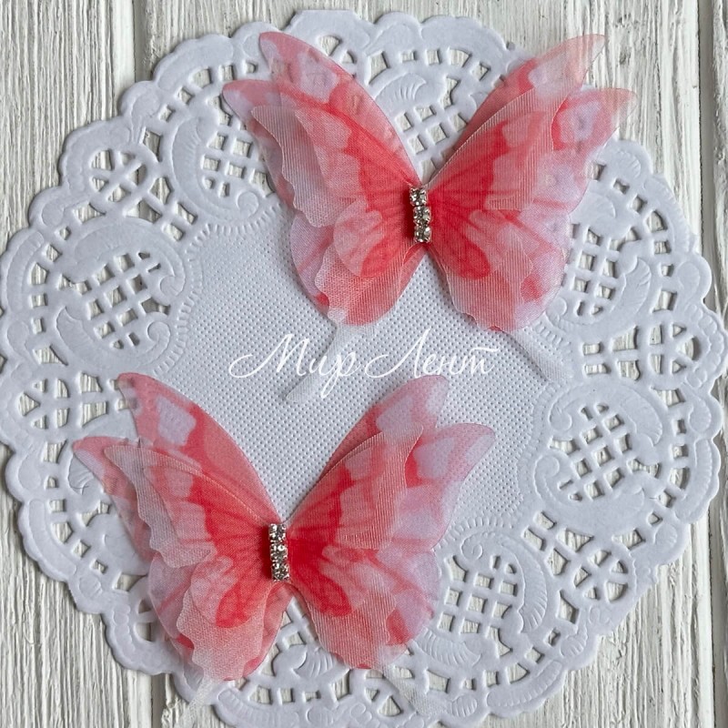 Шифоновая бабочка трехслойная со стразами (хамелеон), 6х5,5 см, розово-коралловая, упаковка 25 шт.