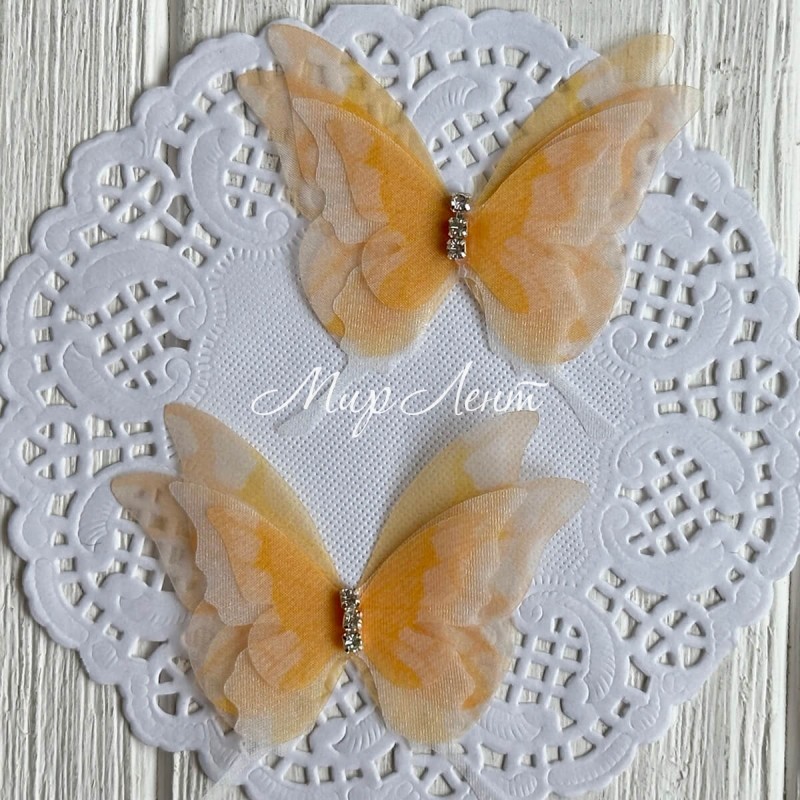 Шифоновая бабочка трехслойная со стразами (хамелеон), 6х5,5 см, темно-желтая, упаковка 25 шт.