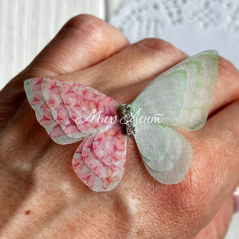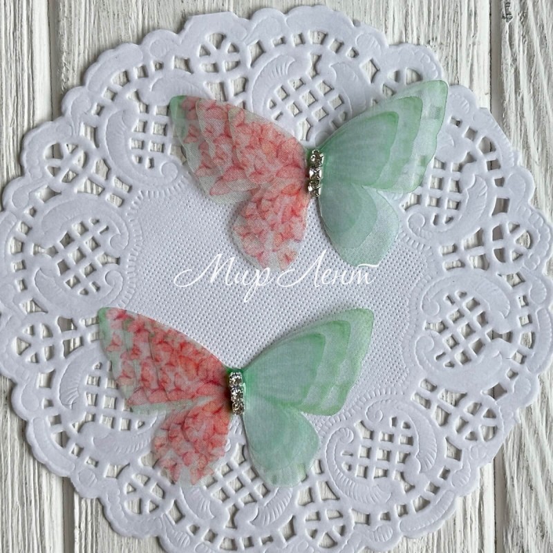 Шифоновая бабочка трехслойная со стразами (двосторонняя), 5,4х4,2 см, кораллово-зеленая, упаковка 25 шт.