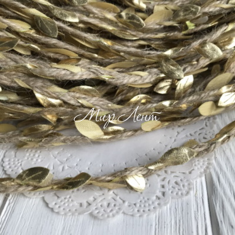Шнур декоративный с листочками, 0,7 см, натуральная бечевка с золотом, моток 50 м