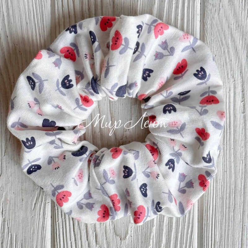 Скранч турецкий трикотаж, 12 см, белый с cеро-коралловыми цветами, шт.