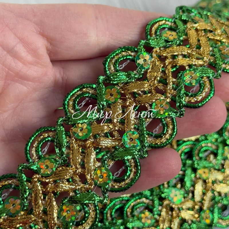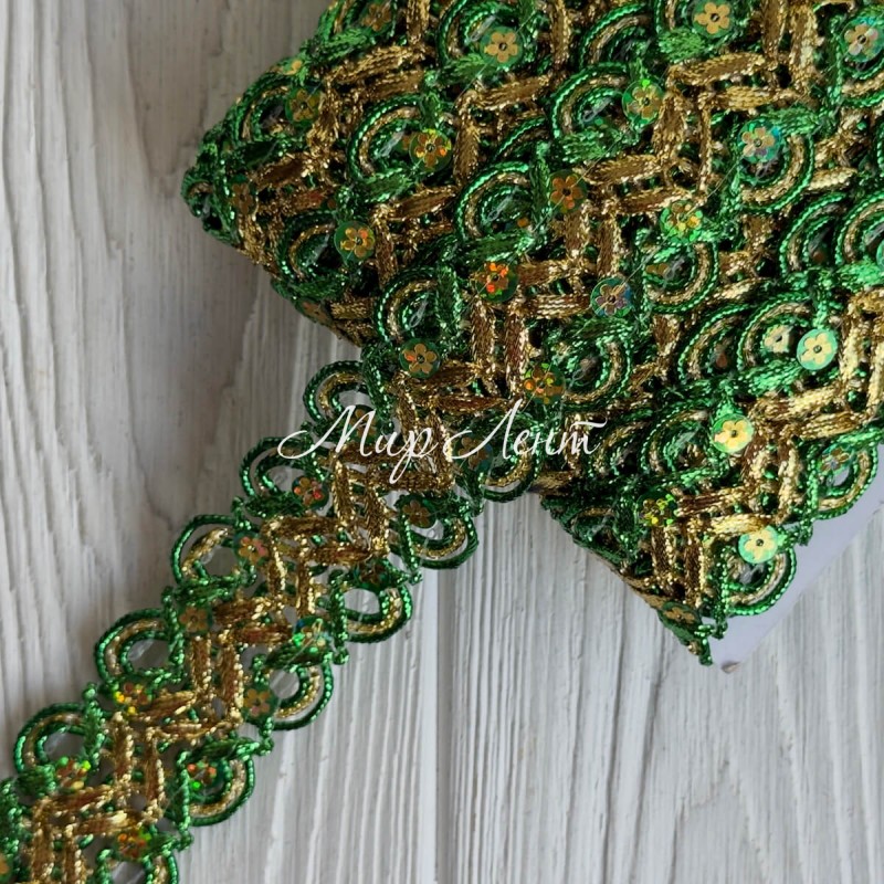 Тесьма с паетками (D30290), 3,8 см, зеленая с золотом, рулон 13 м
