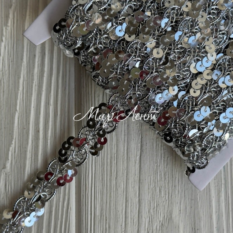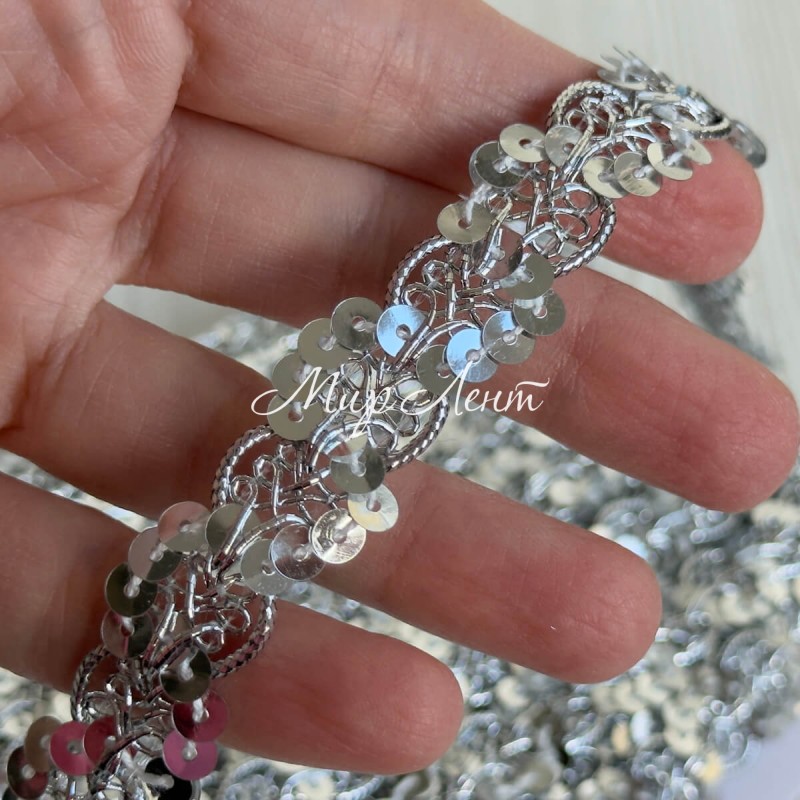 Тесьма с паетками (D30292), 1,7 см, серебро, рулон 13 м