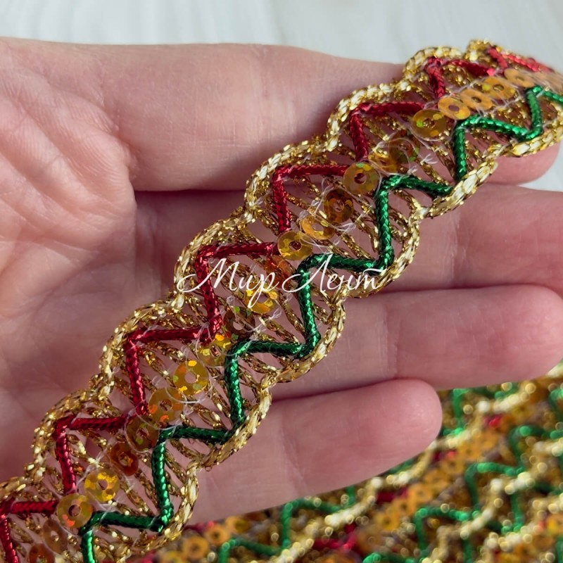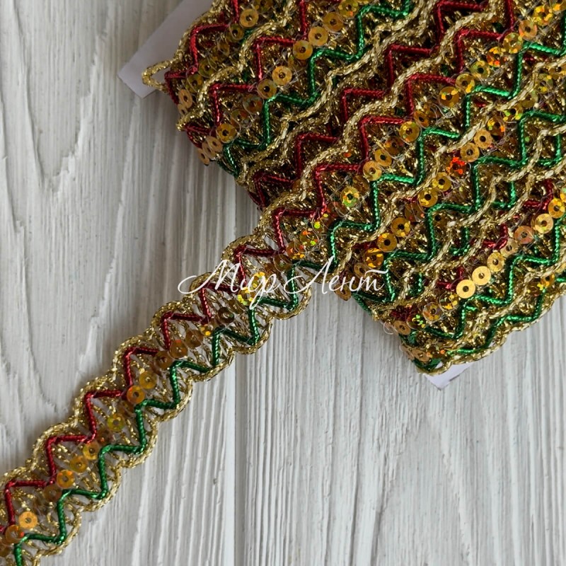 Тесьма с паетками (D30297), 2,3 см, золото с красно-зеленым, рулон 13 м
