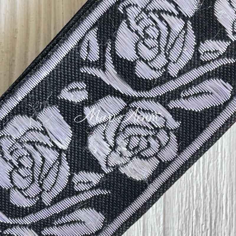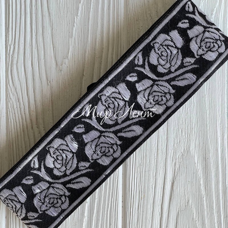 Тесьма вышиванка, 5 см, белая роза на черном, рулон 9 м