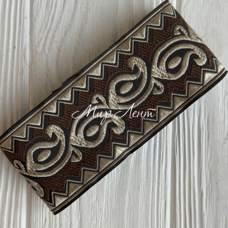Тесьма вышиванка, 5 см, бежевый орнамент на шоколадном, рулон 7 м