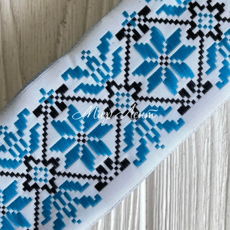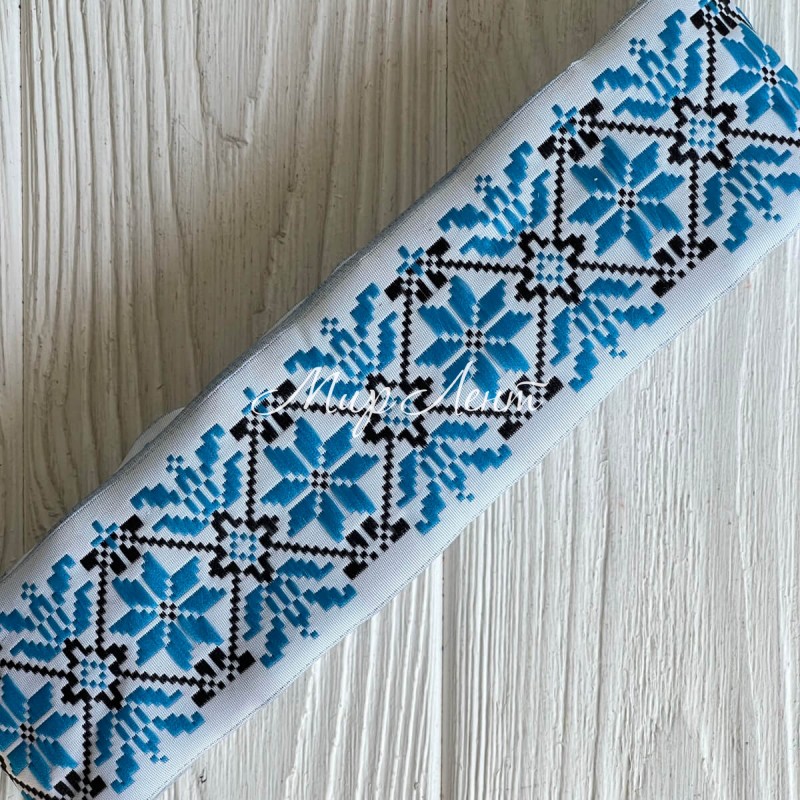 Тесьма вышиванка, 5 см, синий орнамент на белом, рулон 9 м