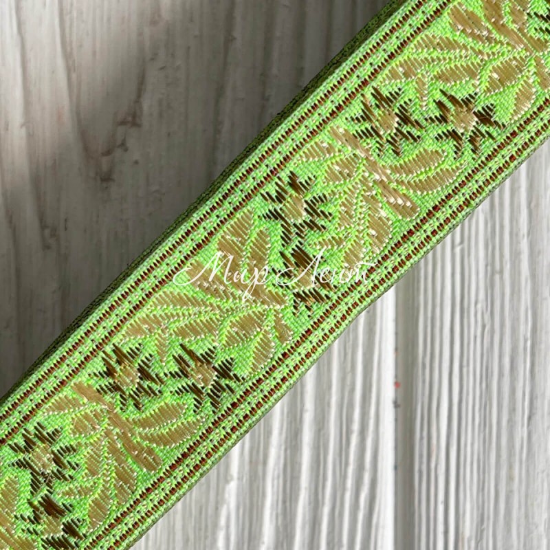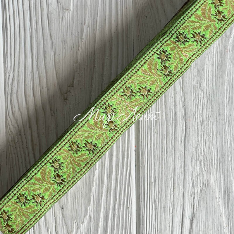 Тесьма вышиванка (барвинок), 2,5 см, карамельно-молочный на салатовом, рулон 9 м