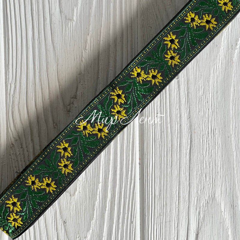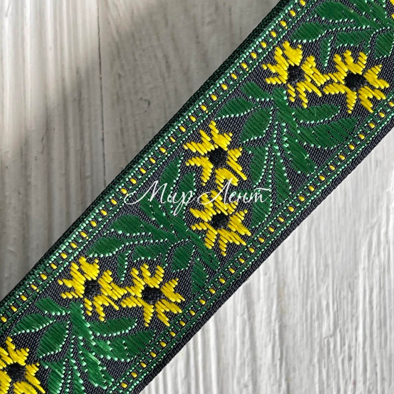 Тесьма вышиванка (барвинок), 2,5 см, желто-зеленый на черном, рулон 9 м