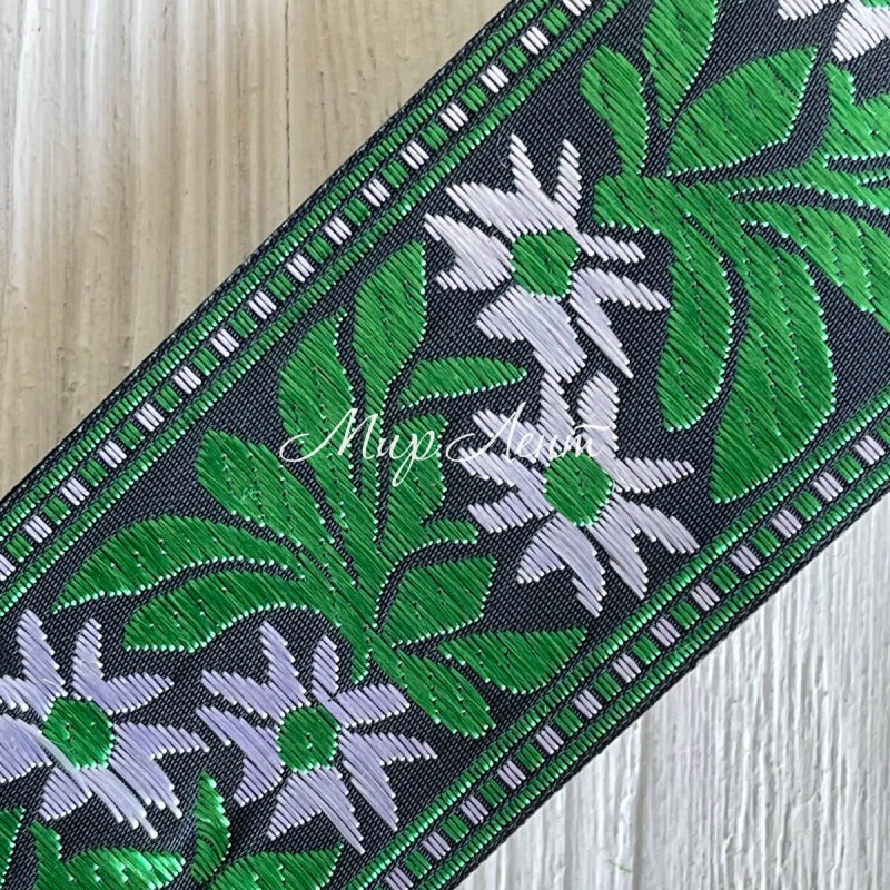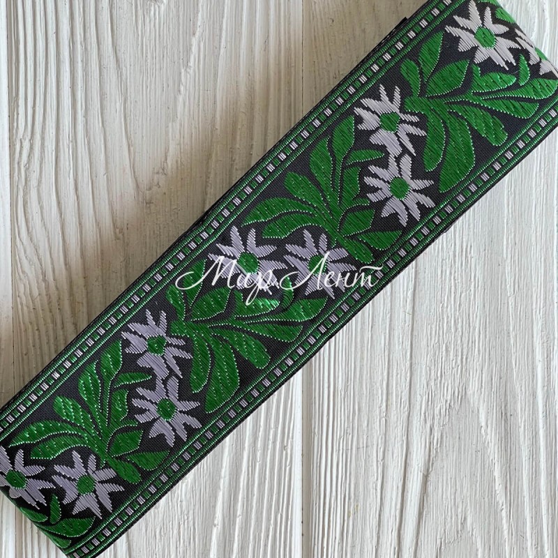 Тесьма вышиванка (барвинок), 5 см, бело-зеленый на черном, рулон 9 м