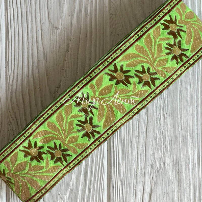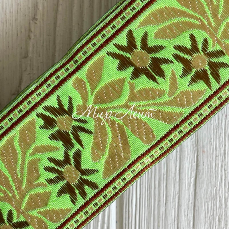 Тесьма вышиванка (барвинок), 5 см, карамельно-молочный на салатовом, рулон 9 м